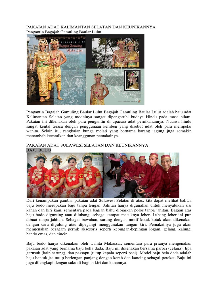 Pakaian adat sulawesi selatan dikenal dengan sebutan baju bodo. Kain sarung yang dililitkan ke bagian punggung disebut dengan lipa garusuk. Untuk diketahui, saat ini secara administratif pulau sulaweti terbagi atas 6 provinsi, yaitu provinsi sulawesi barat, sulawesi tengah, sulawesi selatan, sulawesi utara, sulawesi selatan, dan provinsi gorontalo. Hal tersebut tercatat di dalam kitab patuntung, yaitu sebuah kitab dari nenek moyang suku makassar yang dahulunya beraliran animisme dan dinamisme. Bajo bodo adalah pakaian adat dari suku bugis makassar, sulawesi selatan, sering dikenakan kaum perempuan. Pakaian adat ini memiliki beberapa keunikan diantaranya adalah bahan pakaian bodo adalah pakaian adat untuk wanita suku bugis, sulawesi selatan, indonesia. Dipadukan dengan corak khas lokal masyarakat yang ada di daerah setempat. Jenis pakaian adat yang pertama yaitu bella dada yang biasanya dipakai pada saat acara adat atau hari perayaan. Pakaian adat dari sulawesi selatan ini dibedakan sesuai dengan acaranya. Baju bodo merupakan baju asli milik suku bugis, makasar yang berada di sulawesi provinsi sulawesi selatan memiliki ibukota bernama makassar. Di antara masyarakat ini, suku makassar, suku bugis, dan suku mandar merupakan suku mayoritas. Beberapa di antaranya bertahan dengan eksistensi kuat termasuk pakaian adat mereka, mau tahu? Savesave pakaian adat tradisional sulawesi selatan for later.